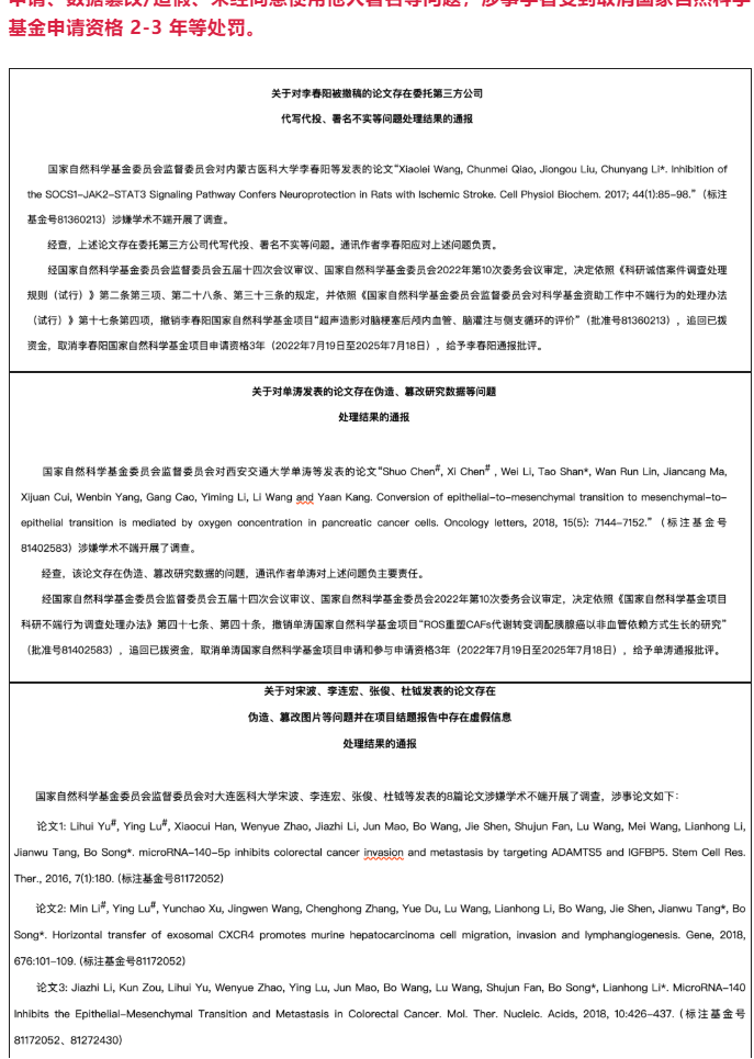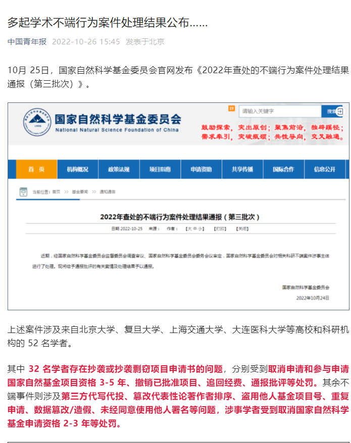 国家自然科学基金委员会官网发布《2022年查处的不端行为案件处理结果通报...
