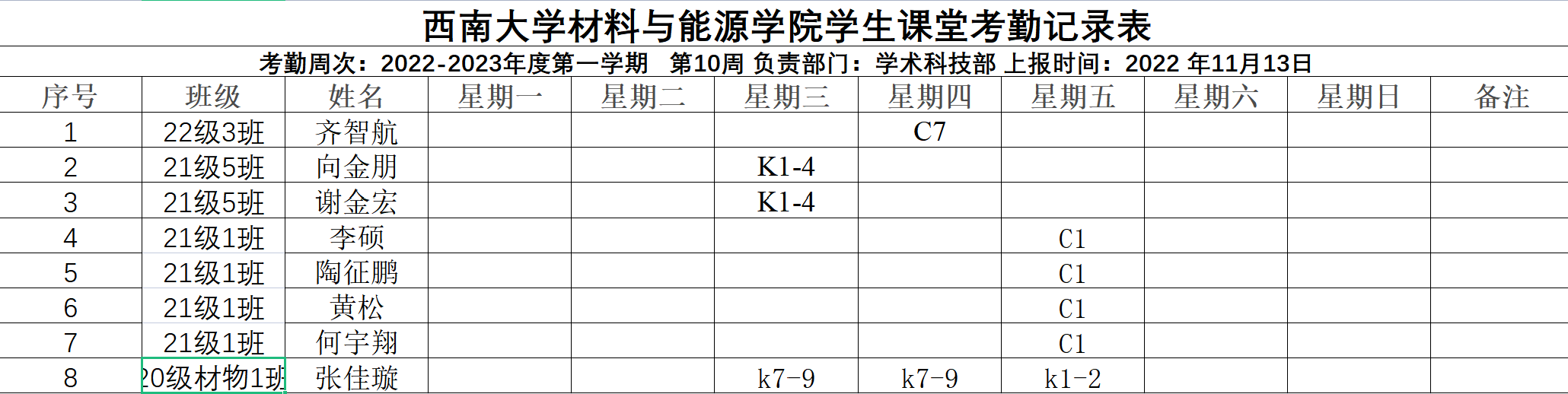 2022-2023年度第一学期太阳成集团tyc539第十周考勤表
