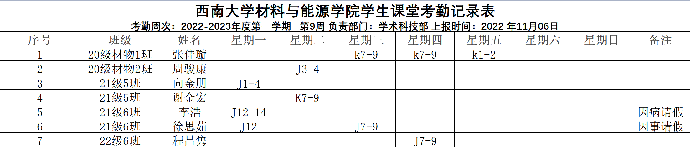 2022-2023年度第一学期太阳成集团tyc539第九周考勤表